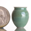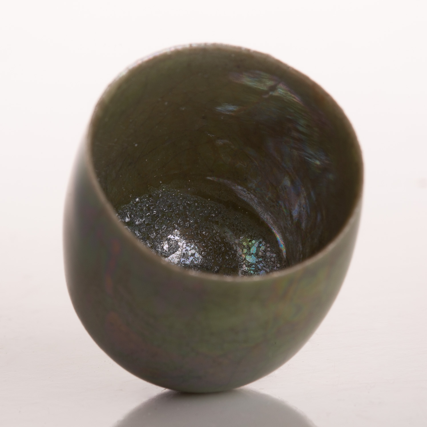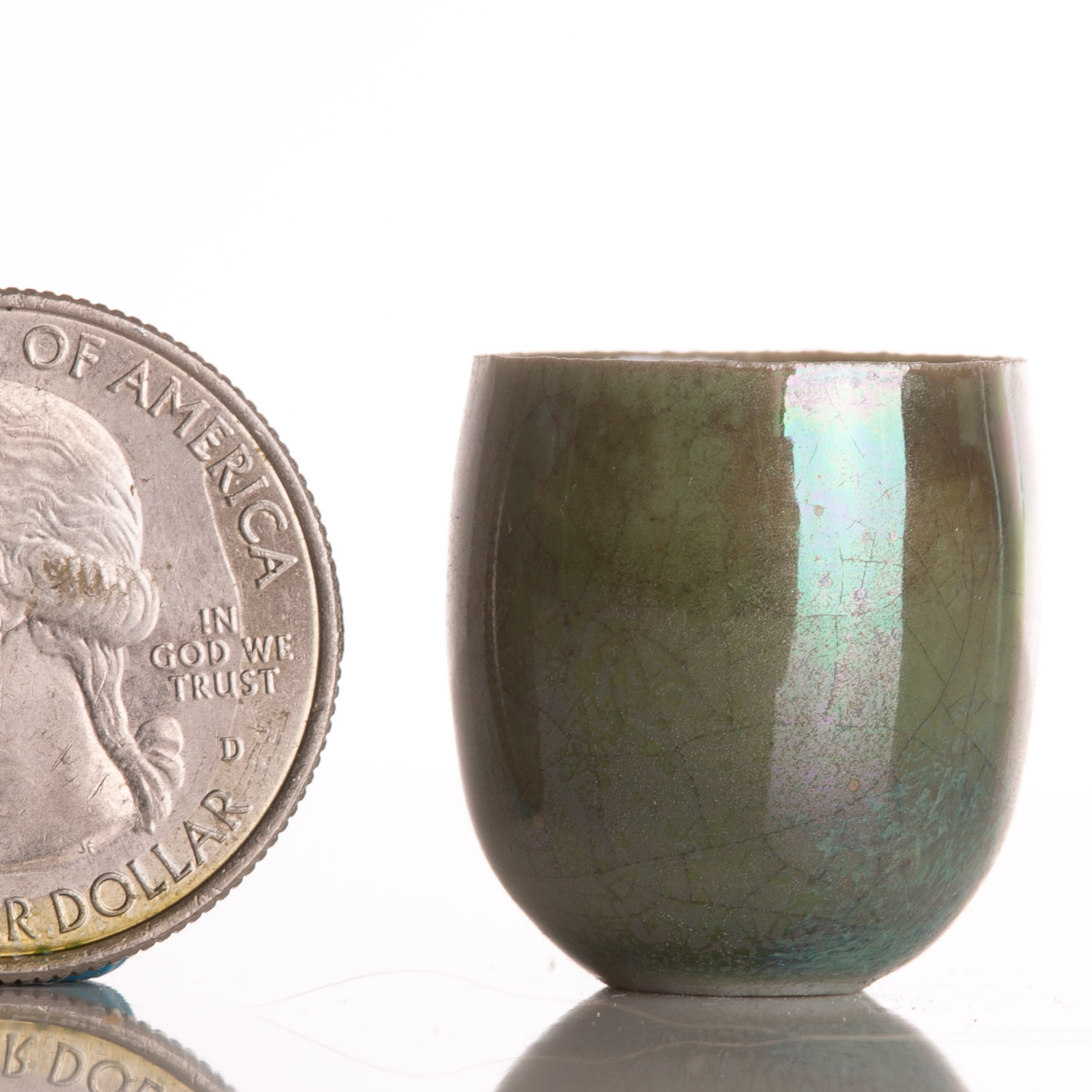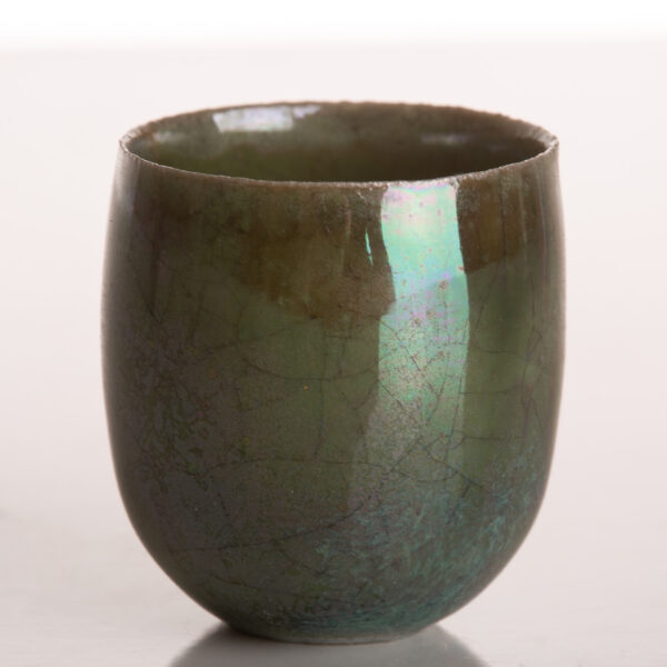 Wheel thrown porcelain vessel with a smooth, rounded form. Its surface is finished in a rich green glaze with subtle iridescent highlights that shift between emerald, aqua, and hints of violet depending on the light. Fine crackle patterns run throughout the glaze, giving the piece depth and character while evoking an aged, timeless quality. The glossy sheen enhances its reflective surface, making it both elegant and earthy.