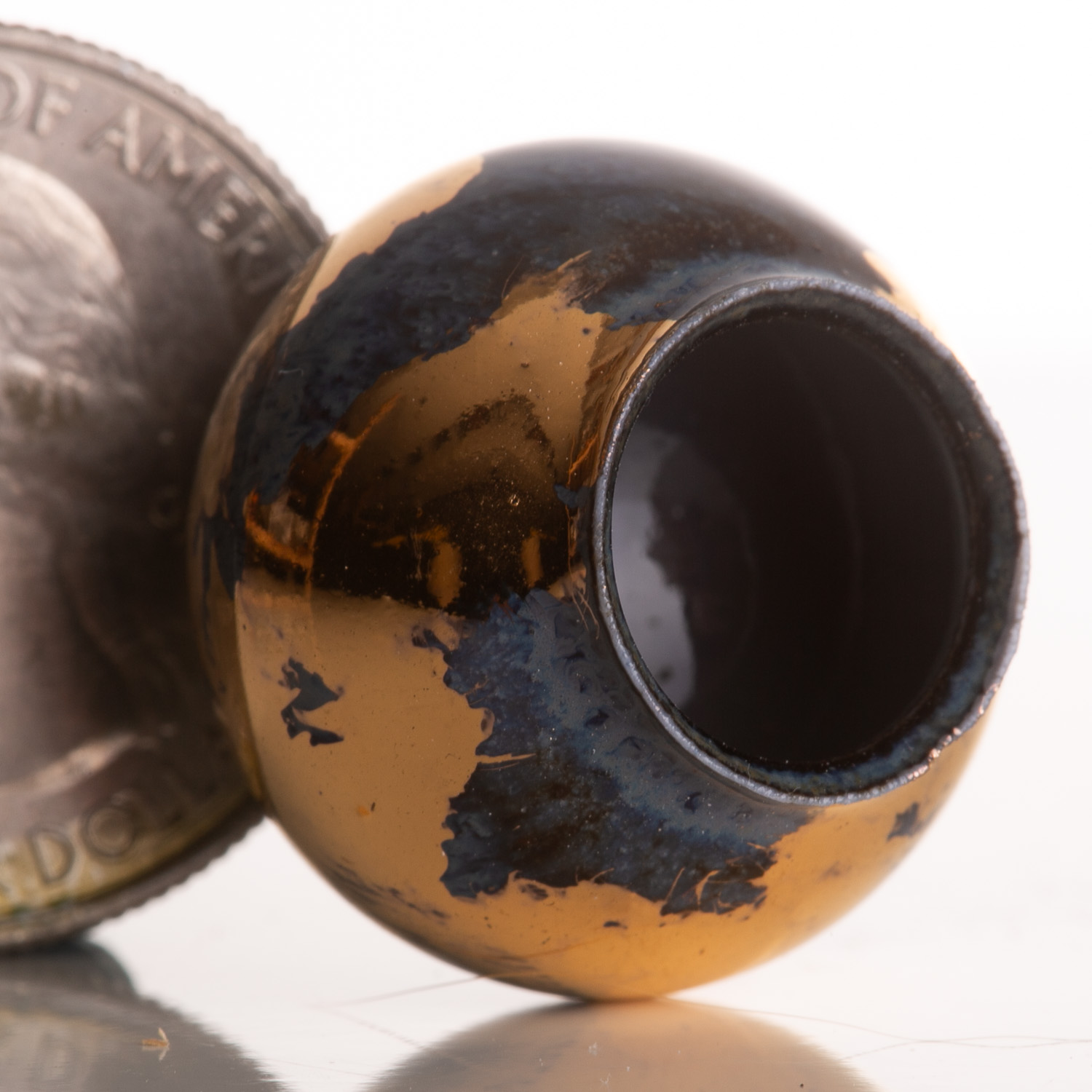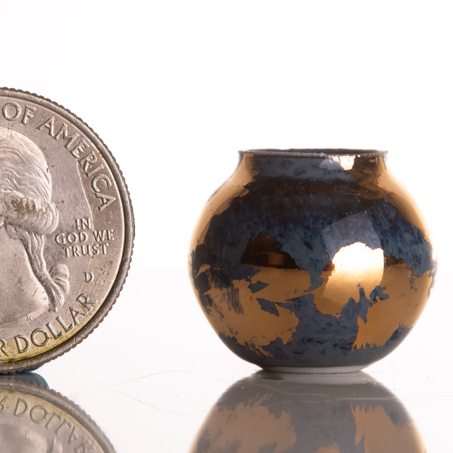 Wheel thrown vase with a round, full body and a narrow opening. The glaze combines deep cobalt blue with sweeping areas of reflective gold, creating a bold contrast and dramatic finish. Pictured next to a US quarter for scale. Quarter is just shy of 1″ tall or 25mm.
