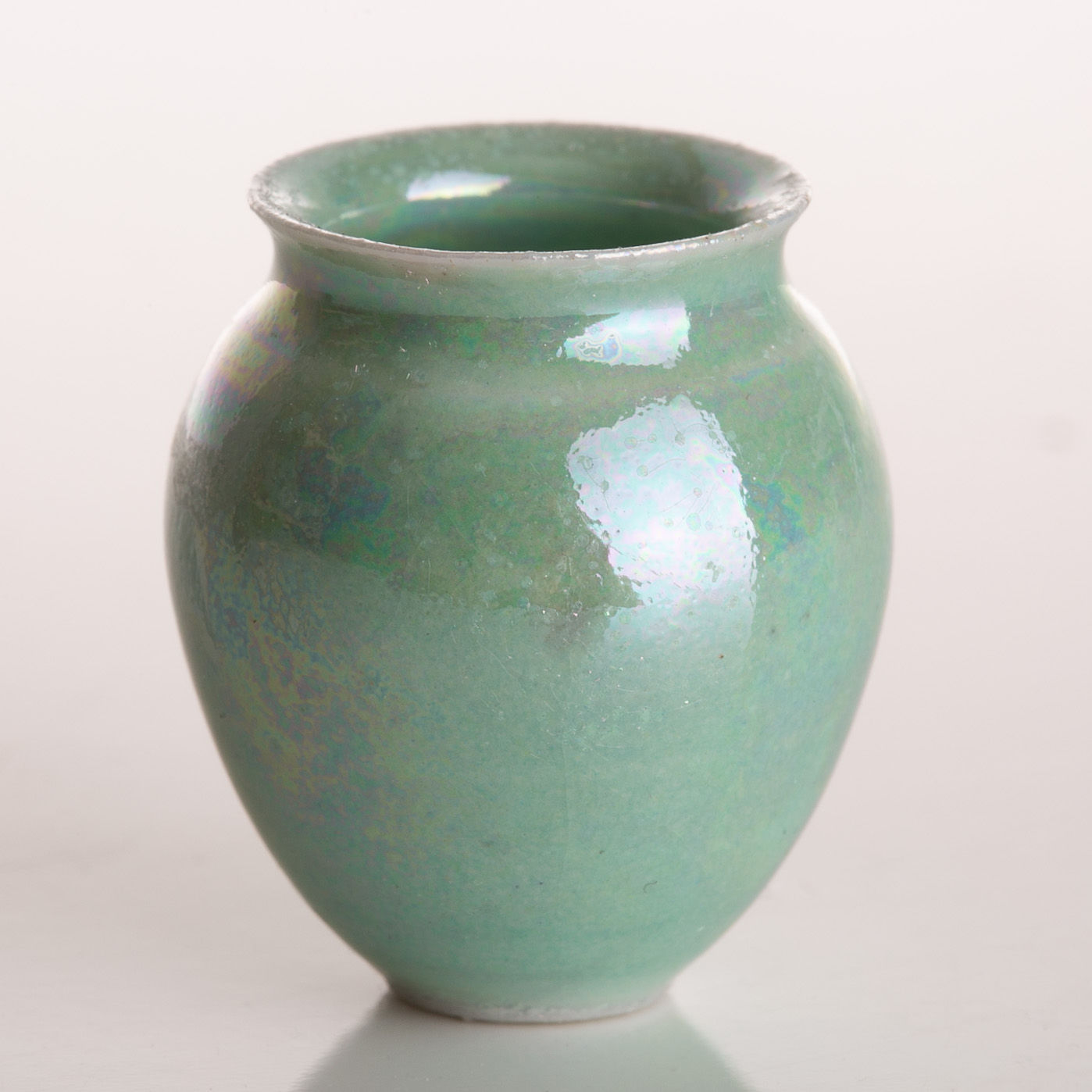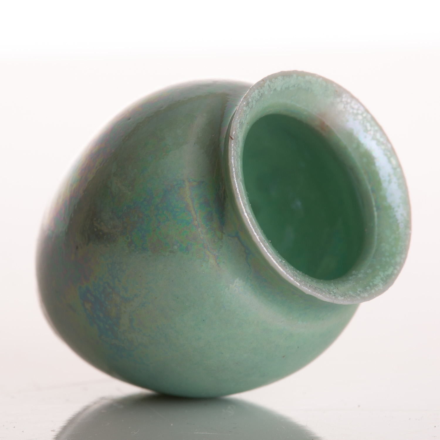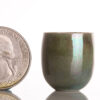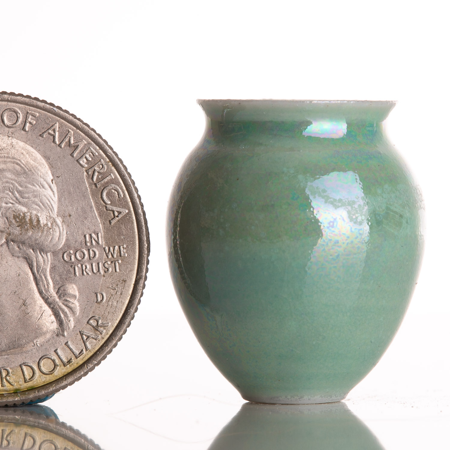 Wheel thrown porcelain vase with a classic rounded body that narrows into a subtly flared rim. The surface is finished in a luminous aqua-green glaze, shifting in tone with soft iridescent highlights that reflect hints of blue and pearl. The smooth sheen enhances the vessel’s refined shape, while subtle glaze variations add depth and natural character. Compact and graceful, this vase embodies a balance of simplicity and quiet sophistication, making it a timeless decorative piece. Quarter is just shy of 1″ tall or 25mm.