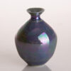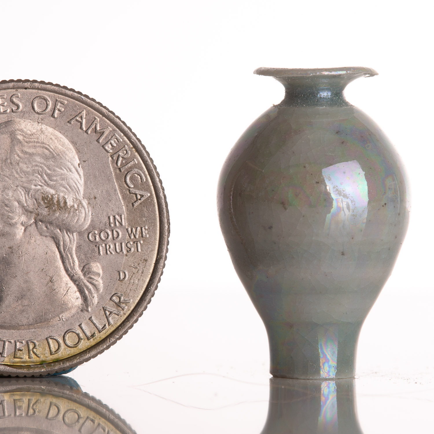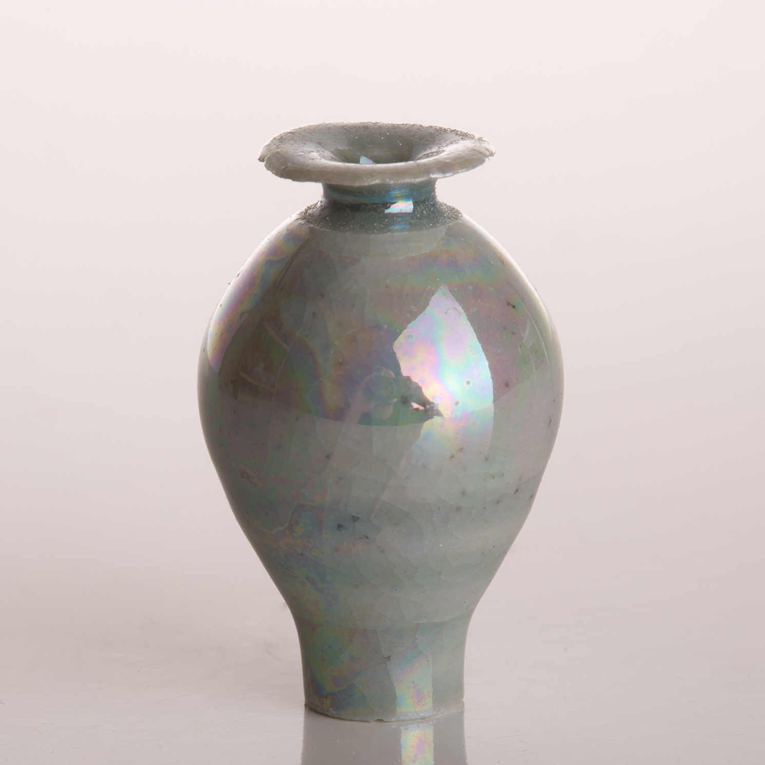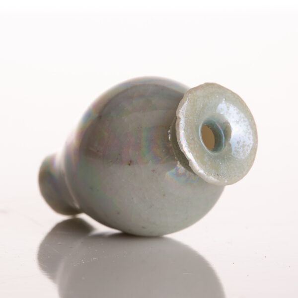 Wheel thrown vase with a gracefully rounded body that rises into a narrow neck and flared rim. The surface is finished in a soft, pale glaze that shimmers with subtle iridescent tones of pearl, lavender, and aqua, shifting beautifully in the light. Fine crackle patterns beneath the glossy surface add depth and texture, giving the piece both delicacy and character. Elegant and luminous, this vase captures a serene, ethereal presence. Pictured next to a US quarter for scale. Quarter is just shy of 1″ tall or 25mm.